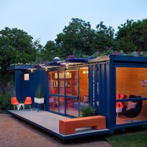 Yeniden tasarlanmış bir nakliye konteynırından yapılan dış kaplama, koyu sedir kaplamayı orijinal metal konteynır ile birleştirir. Çatı güvertesine sarmal bir merdivenle erişilir ve çevrenin manzarasının keyfini çıkarabilmeniz için kablolu metal güvenlik korkulukları vardır. Üst rayın altındaki LED ışıklar harika bir akşam ambiyansı yaratır.